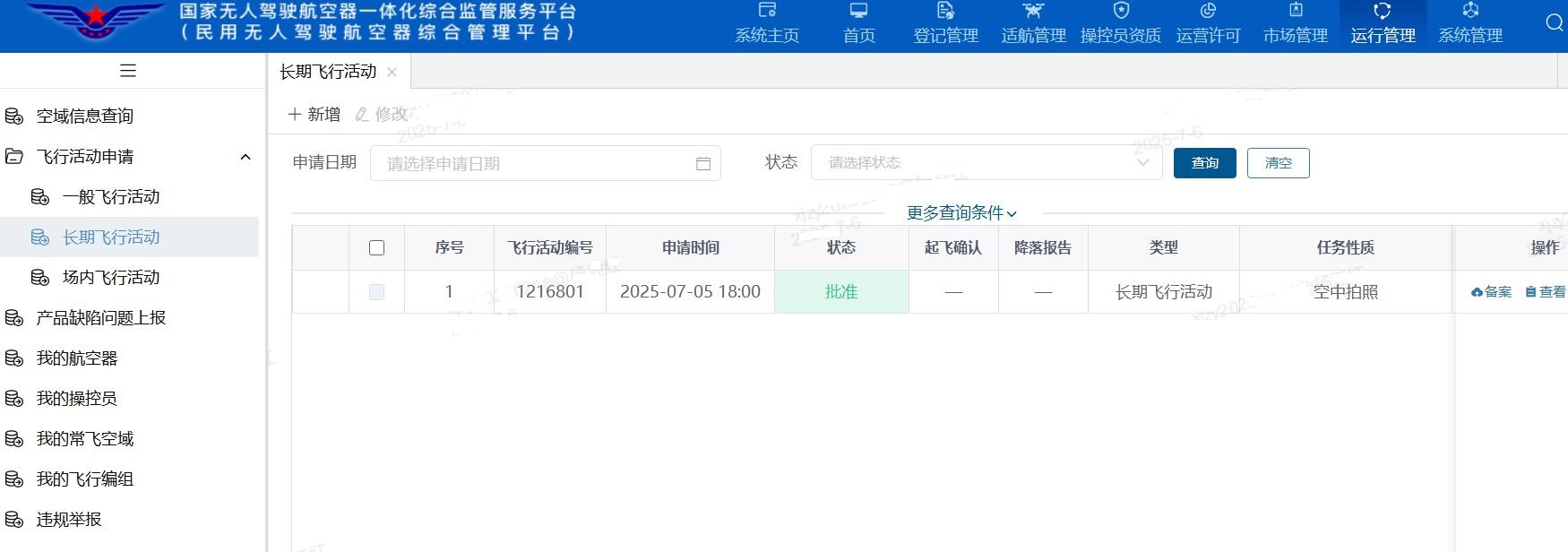 3、进入飞行活动申请: 点击“运行管理”模块,选择“飞行活动申请”,填写相关信息: