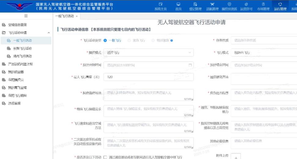 点击页面菜单栏中的 “运行管理”,再点击 “飞行活动申请”。可以申请 “一般飞行活动”和“长期飞行活动”2种。