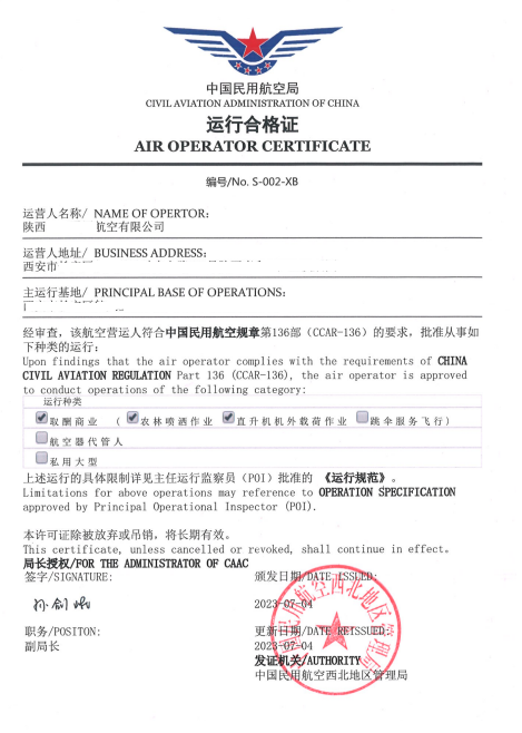1、运营主体必须事先取得中国民航局颁发的《通用航空经营许可证》